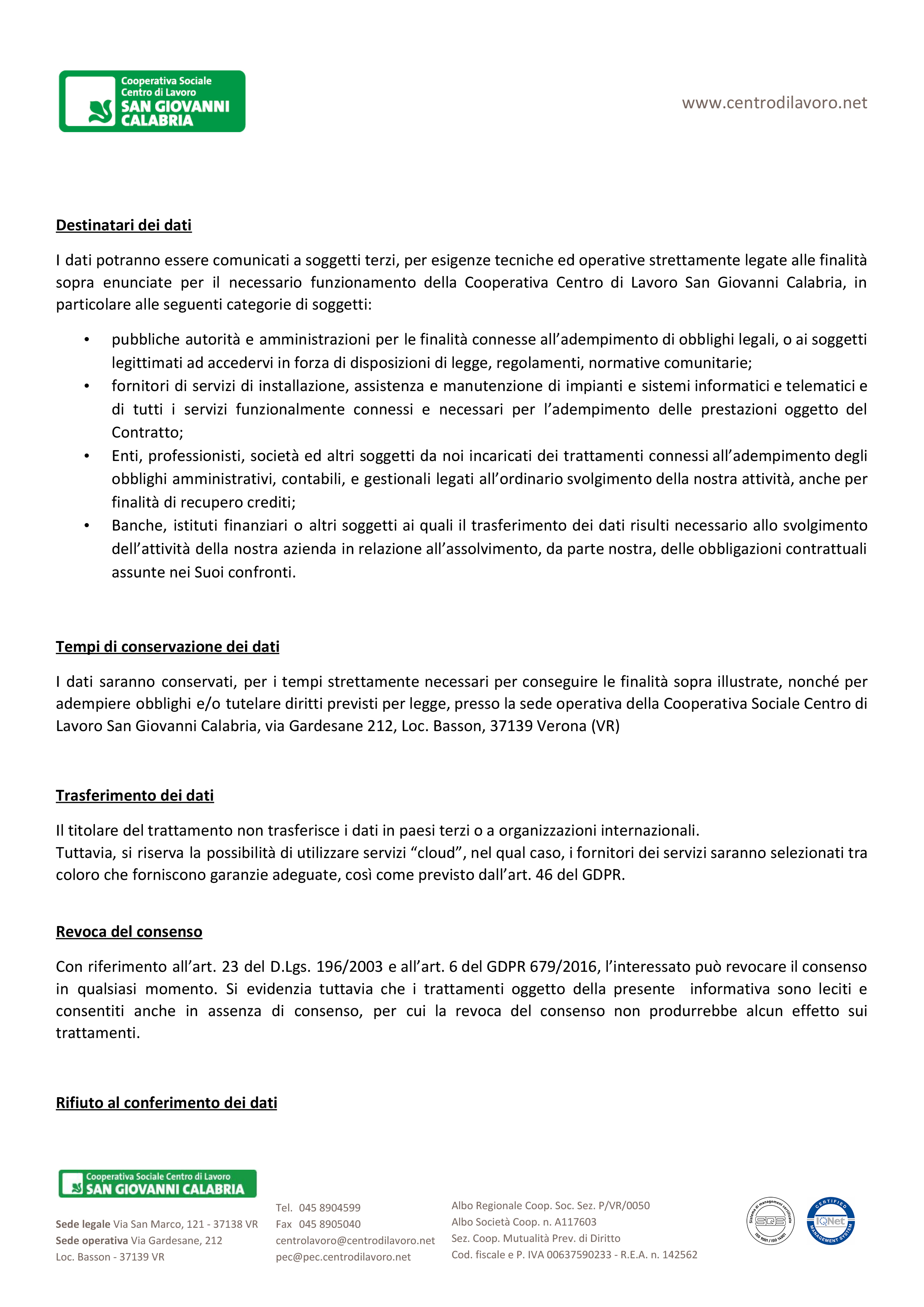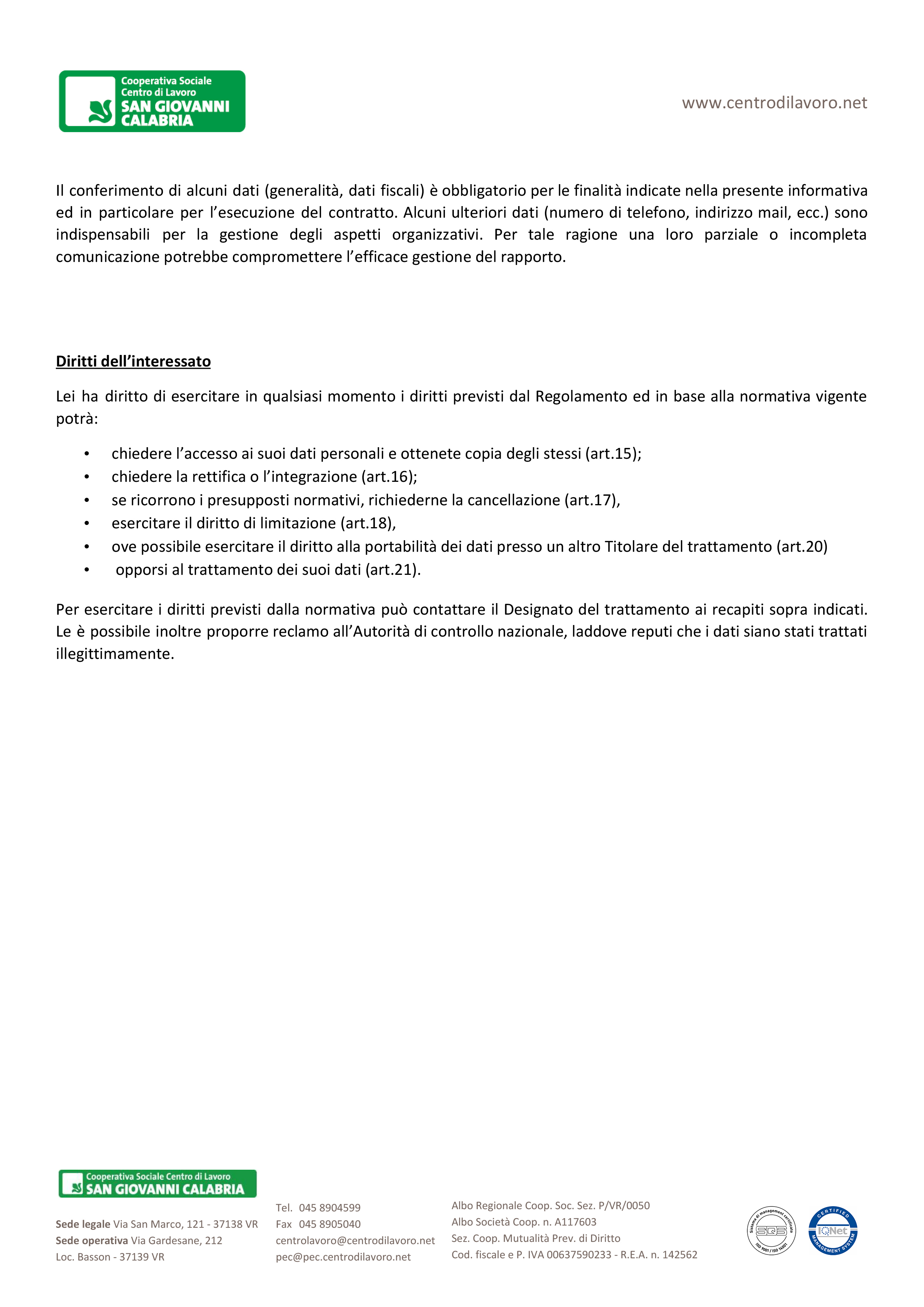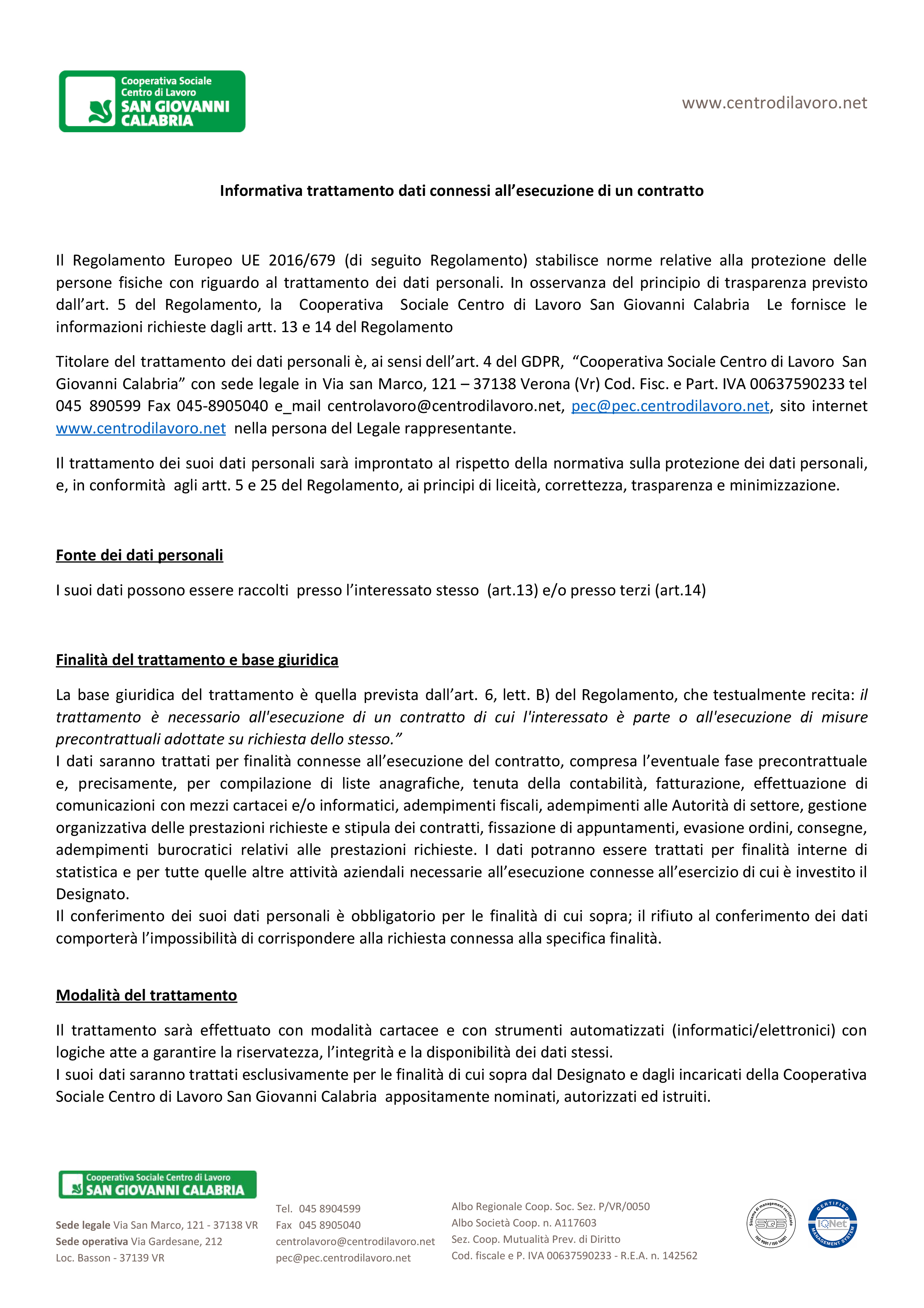 Informativa trattamento dati connessi all’esecuzione di un contratto